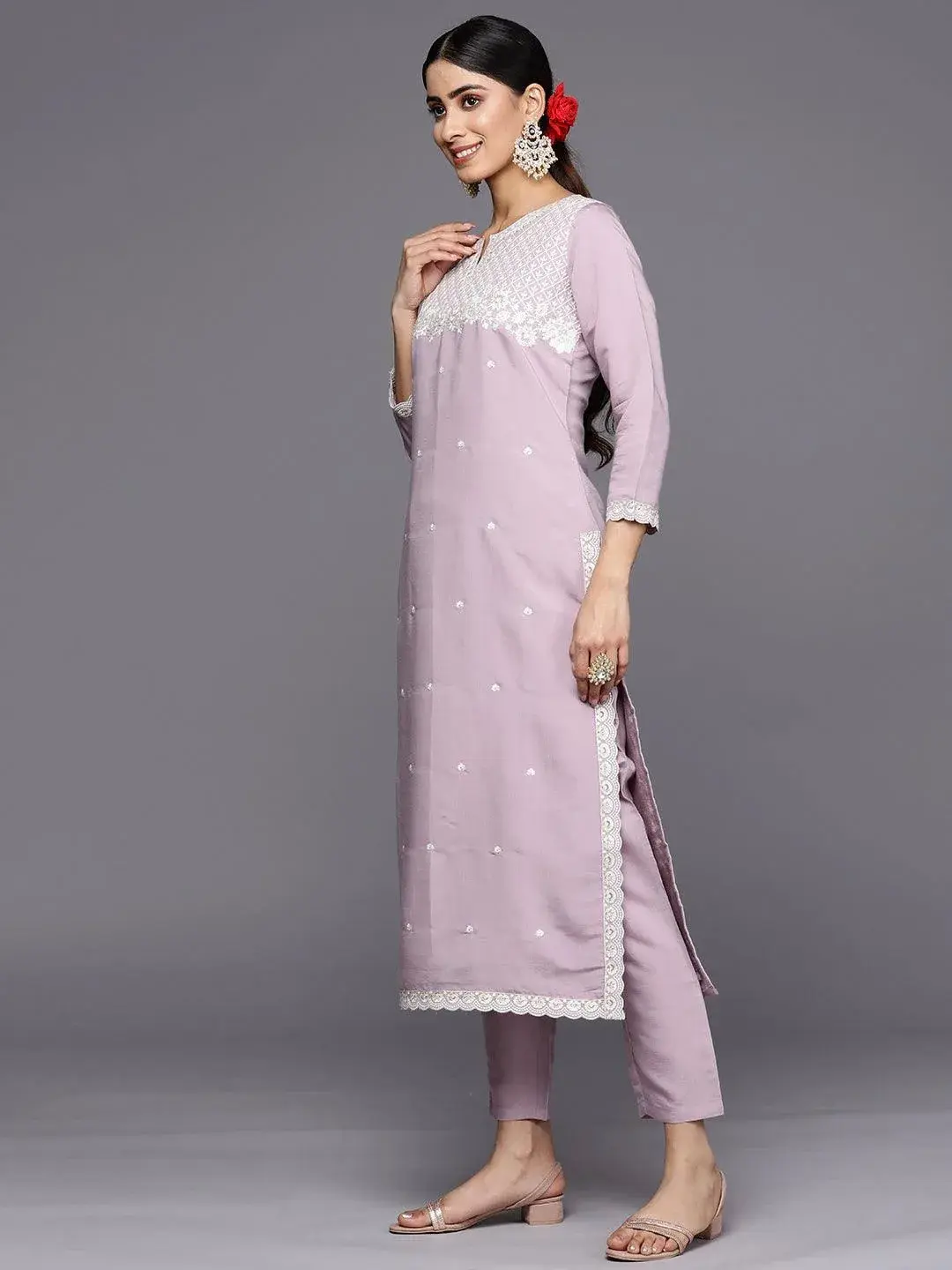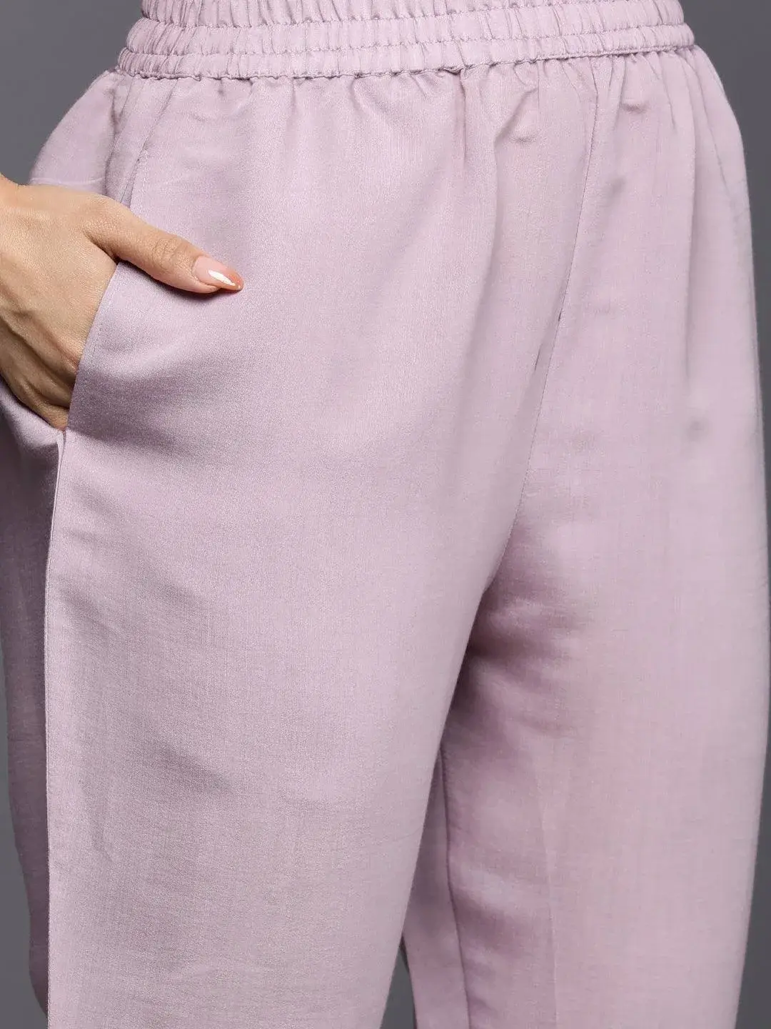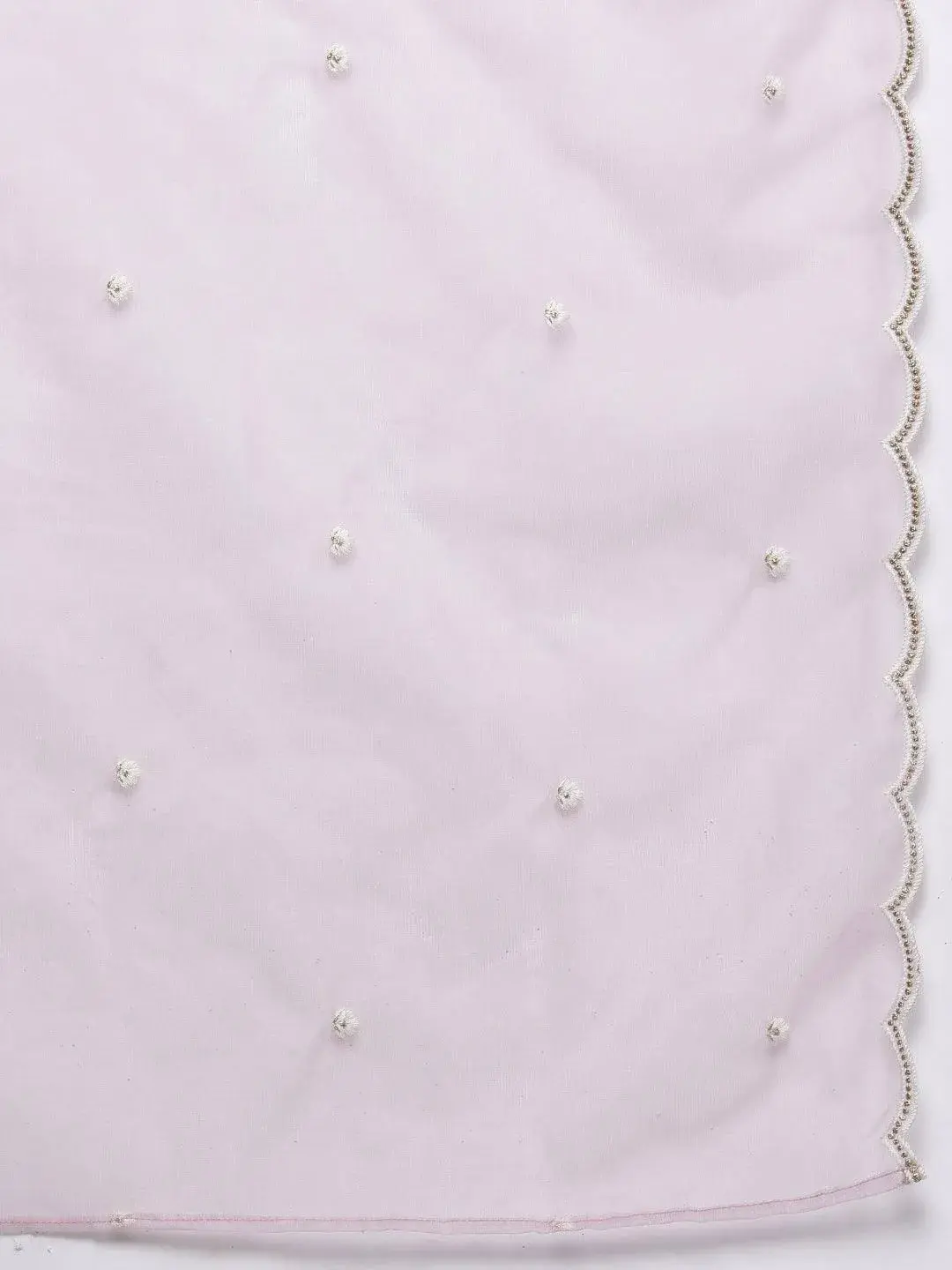 Complemented with solid tone straight pants with an elasticated waistband and roomy pockets, and a matching organza dupatta with scalloped detailing. Adorned with intricate thread-work detailing and delicate sequins accents, this charming style is ideal for light festivities.