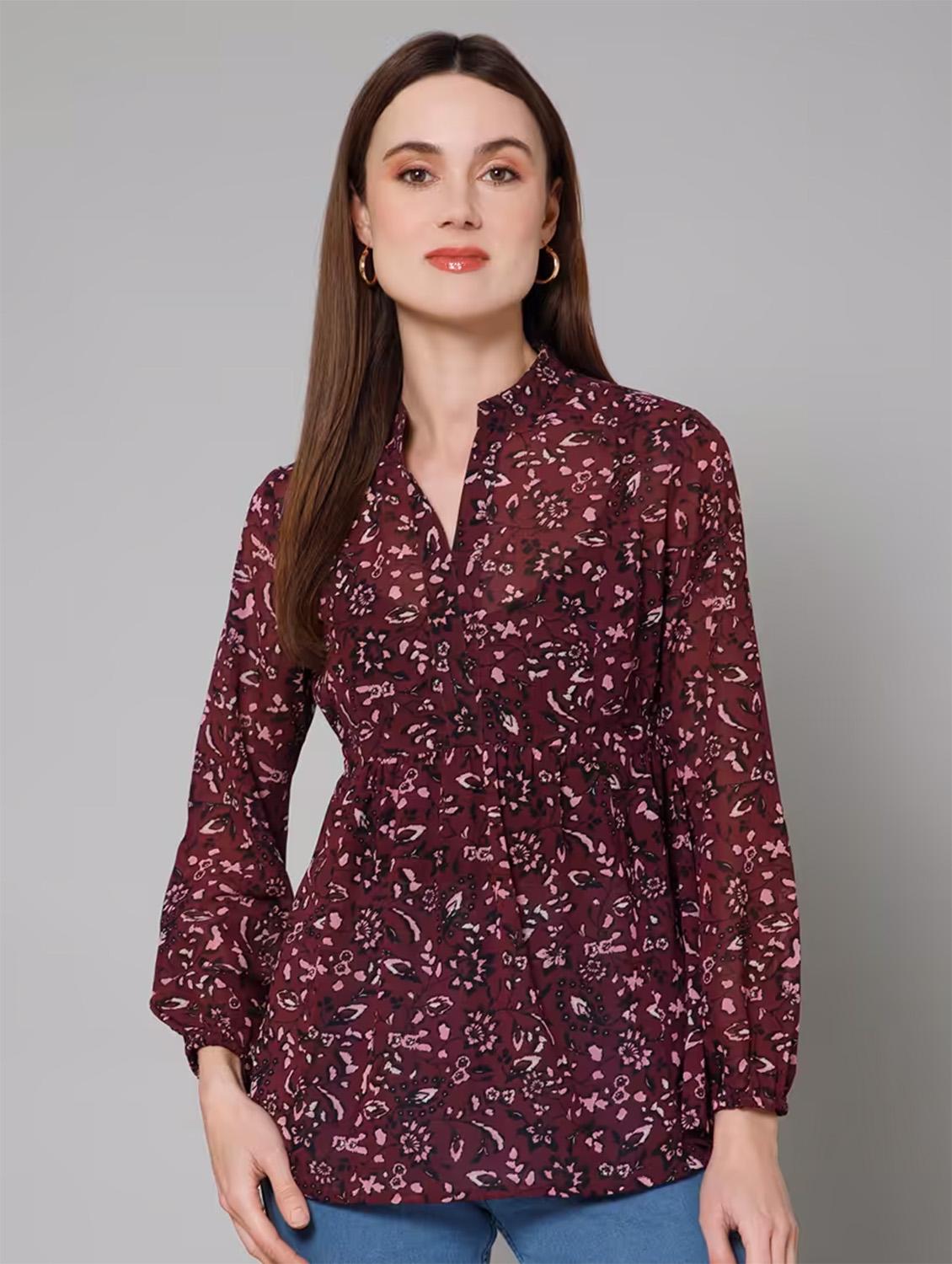 maroon floral printed detailed casual top