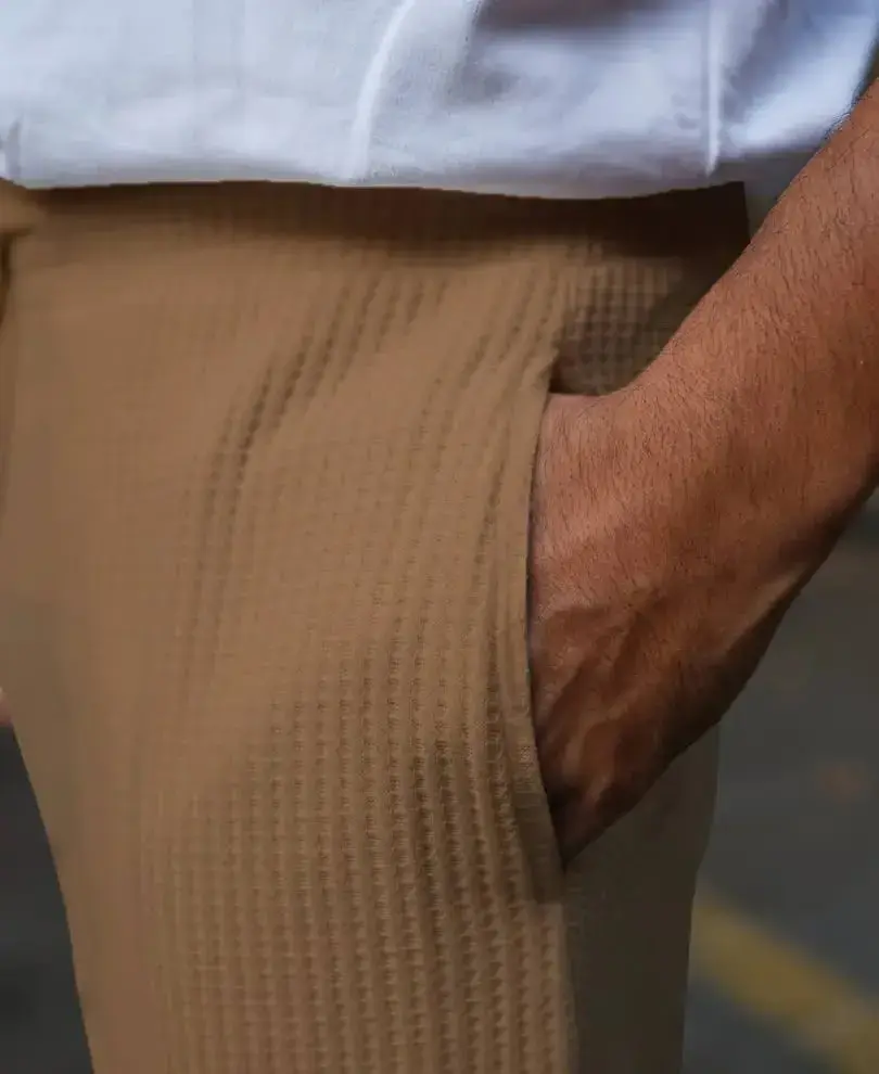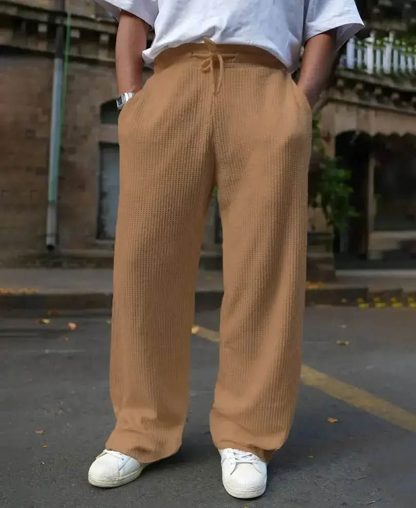 Step into comfort with our beige baggy-fit track pants for men, featuring a customizable drawstring. The sandy color and flattering silhouette fly at both work and leisure. The stretchy fabric moves with you during commutes. Pair with a crisp button-down shirt for important meetings, or dress down with a graphic tee for leisure trips.