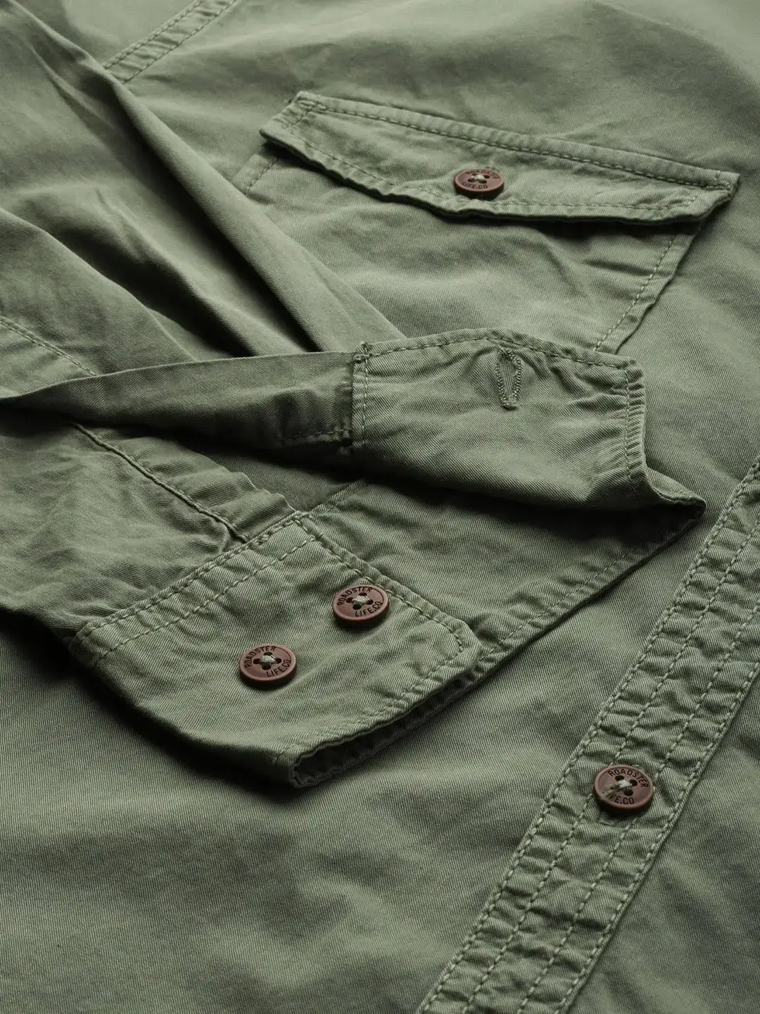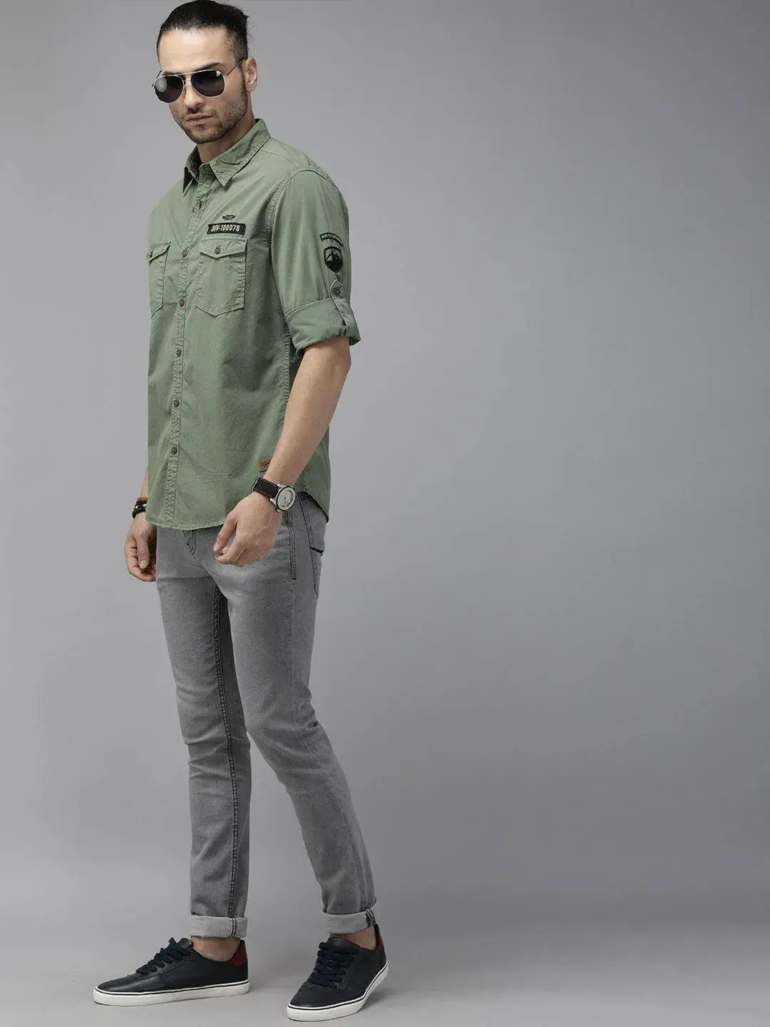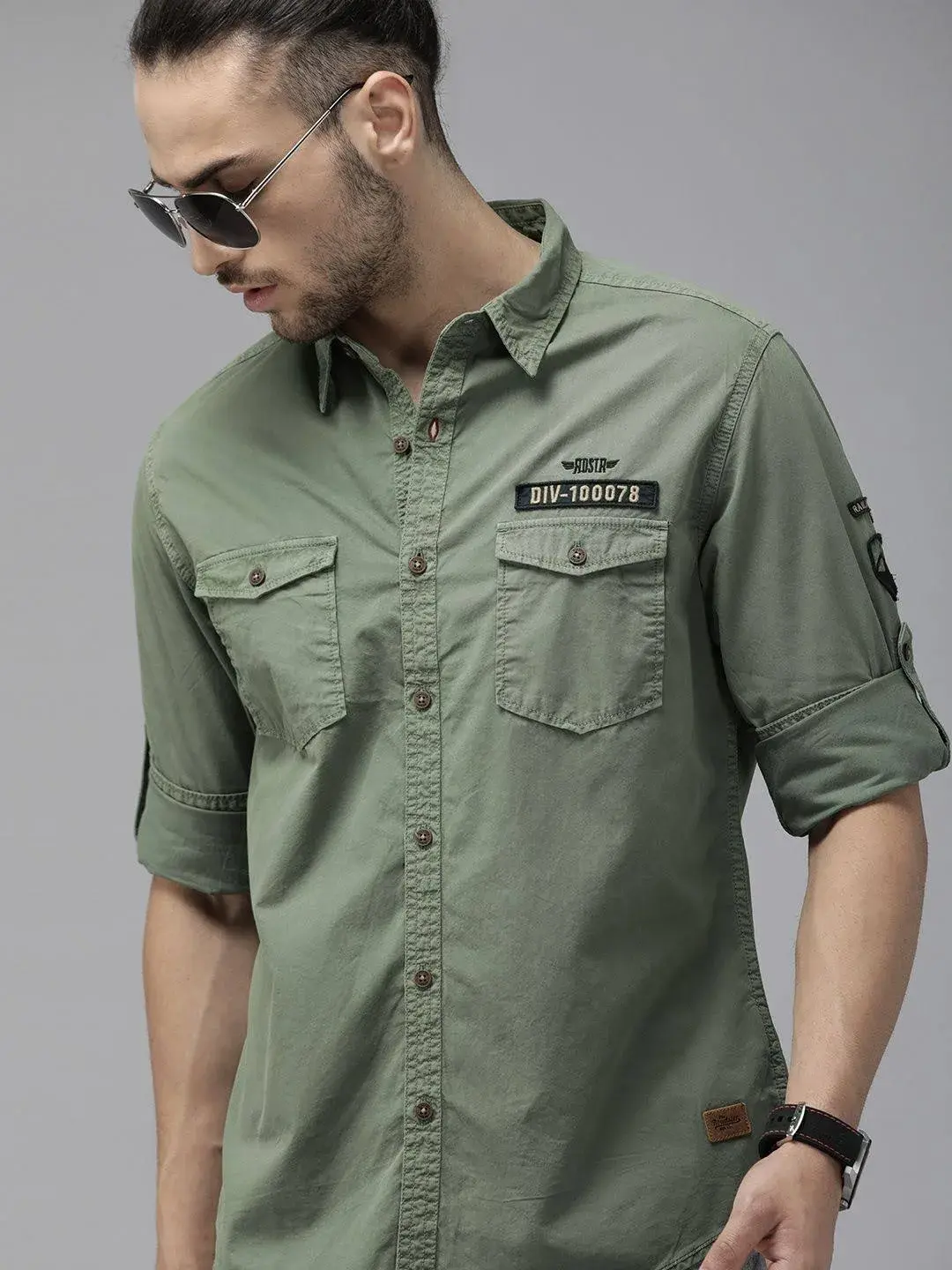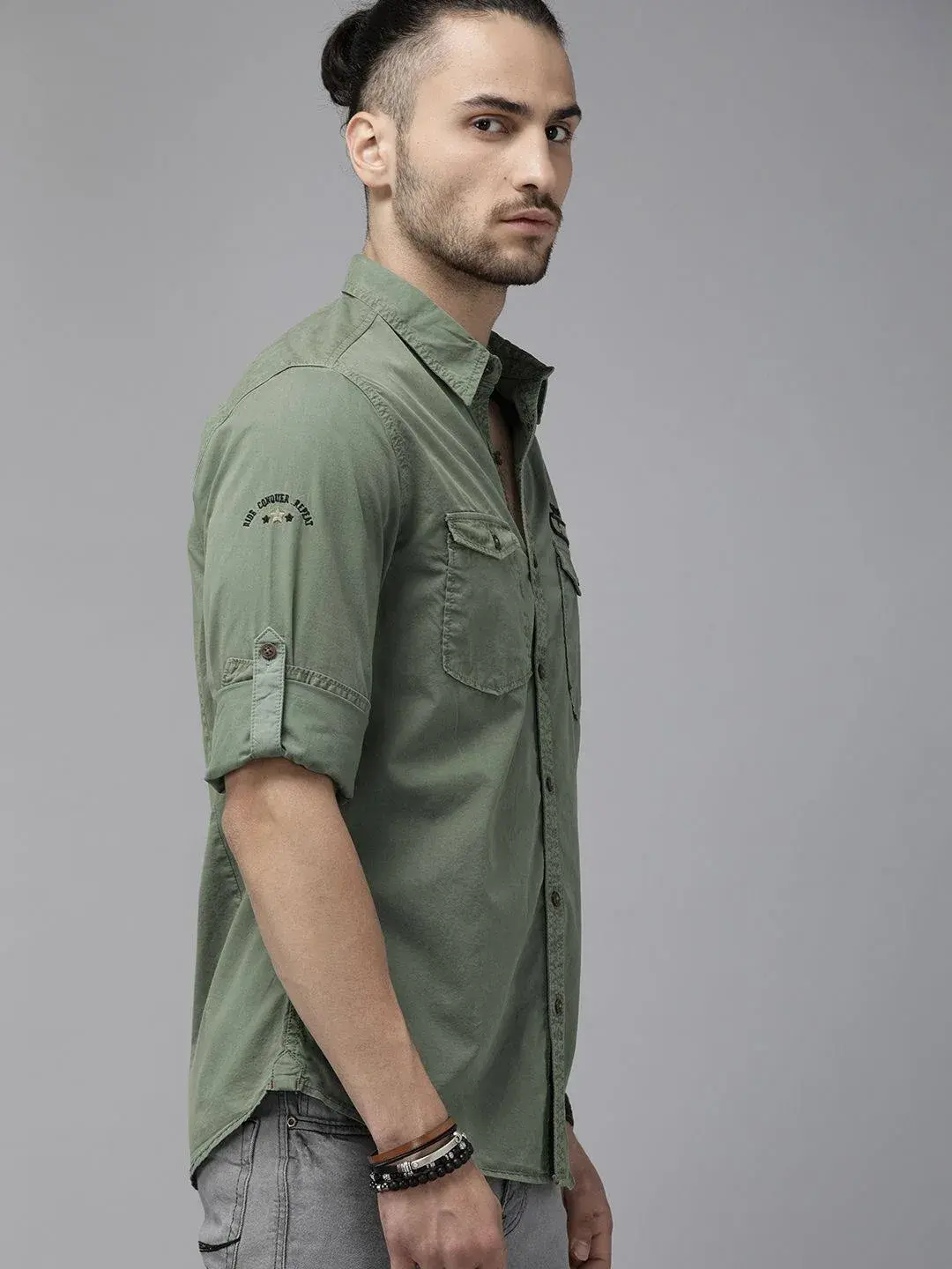 Olive green solid casual shirt with applique detail, has a spread collar, long roll-up sleeves, button placket, curved hem and 2 flap pockets