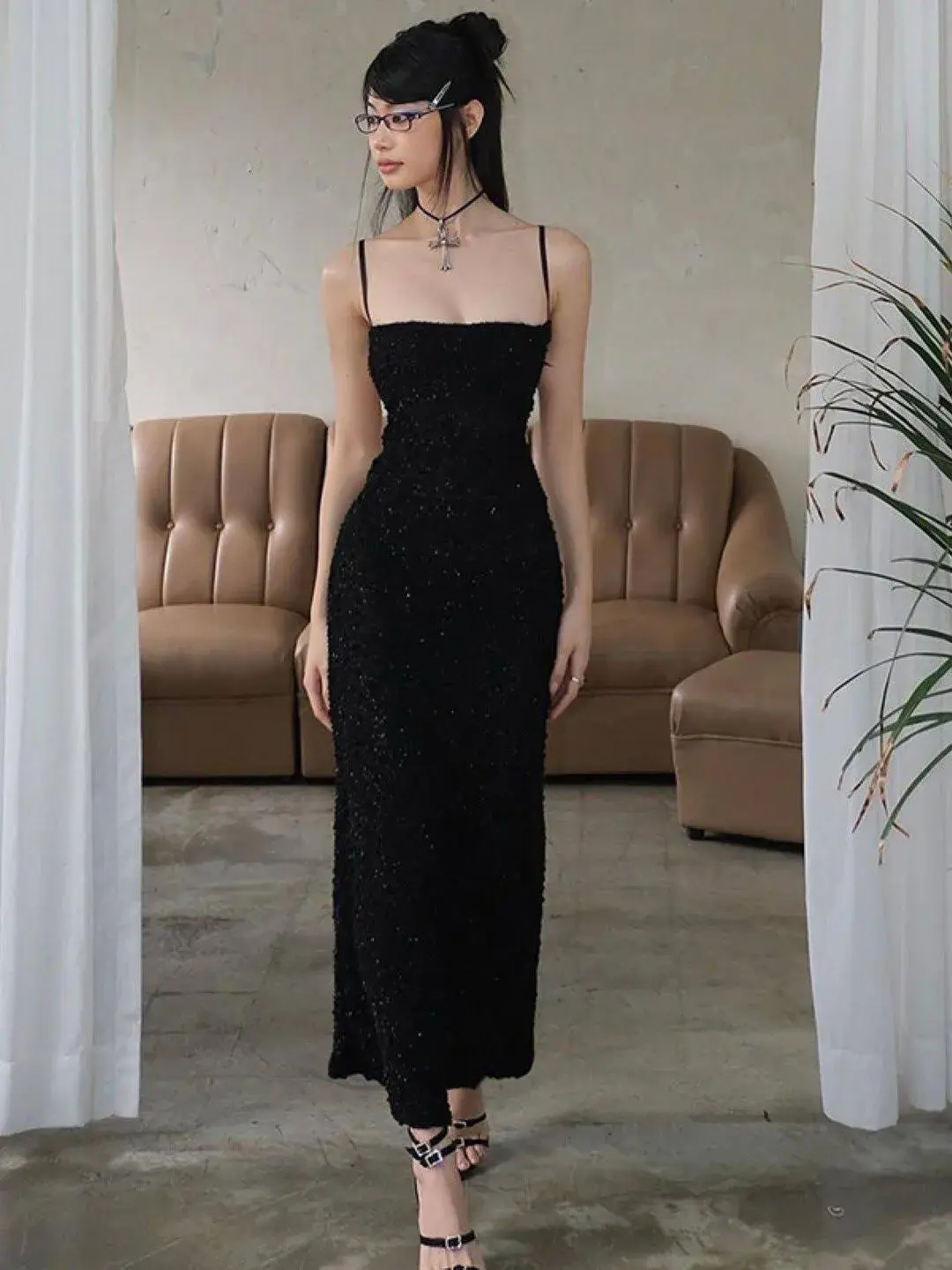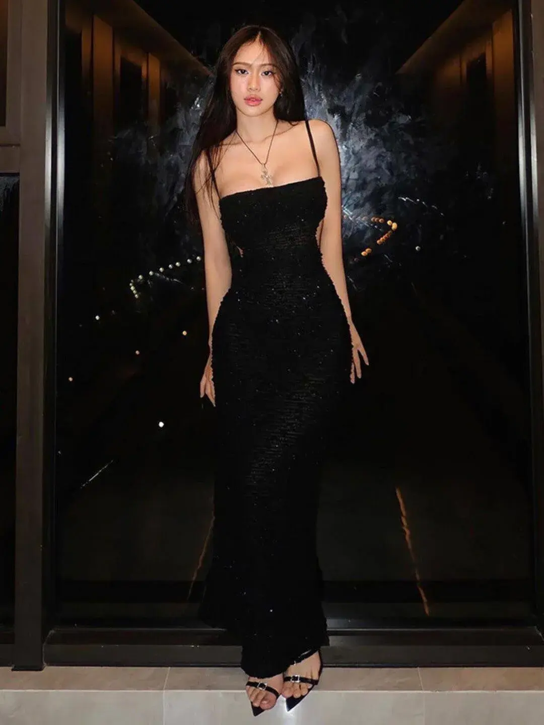 Black solid maxi dress Shoulder straps Sleeveless, no sleeves Maxi length in flared hem