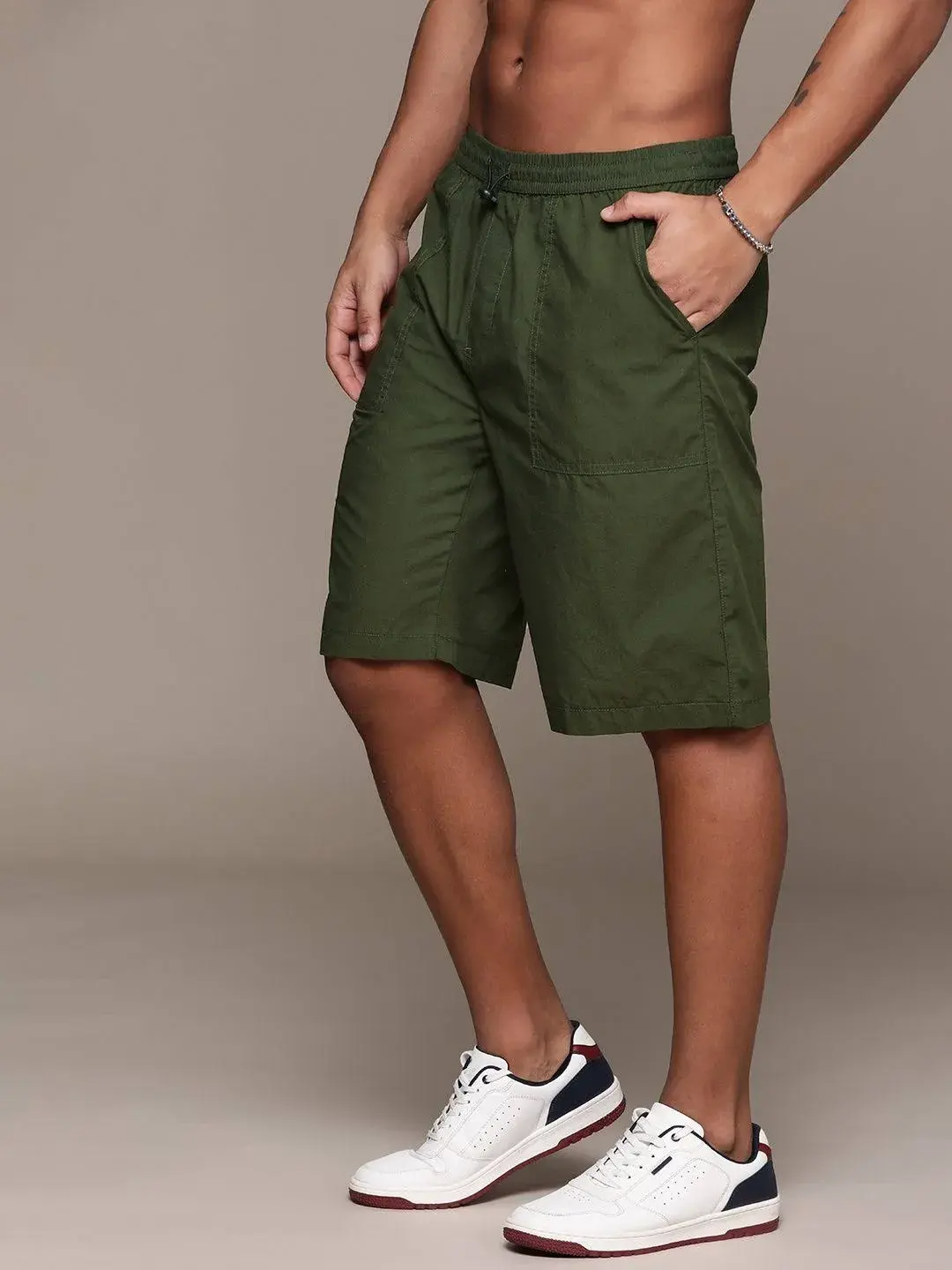 Olive green solid mid-rise regular shorts, has 3 pockets, drawstring closure