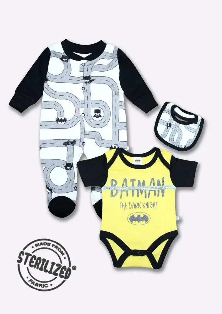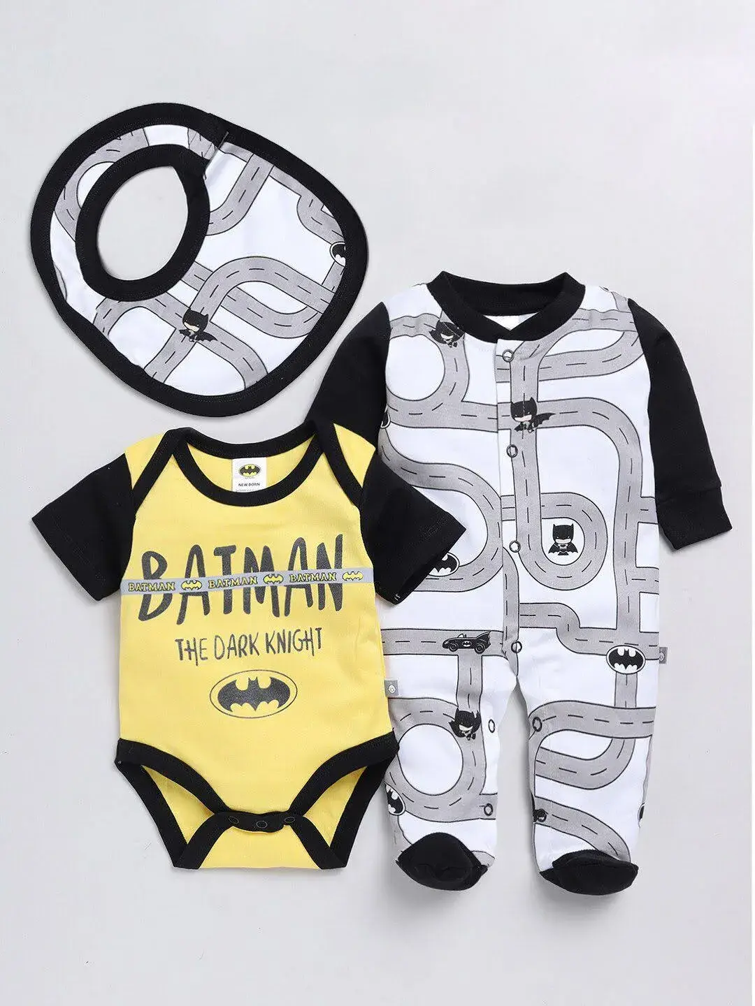 This apparel gift set contains a bodysuit, sleepsuit with bib Assorted printed bodysuit, has envelop neck, short sleeves, snap button closure near the crotch Assorted striped sleepsuit, has long sleeves, round neck with snap button closure through the crotch till the legs, attached booties. Comes with matching bib, has velcro closure.