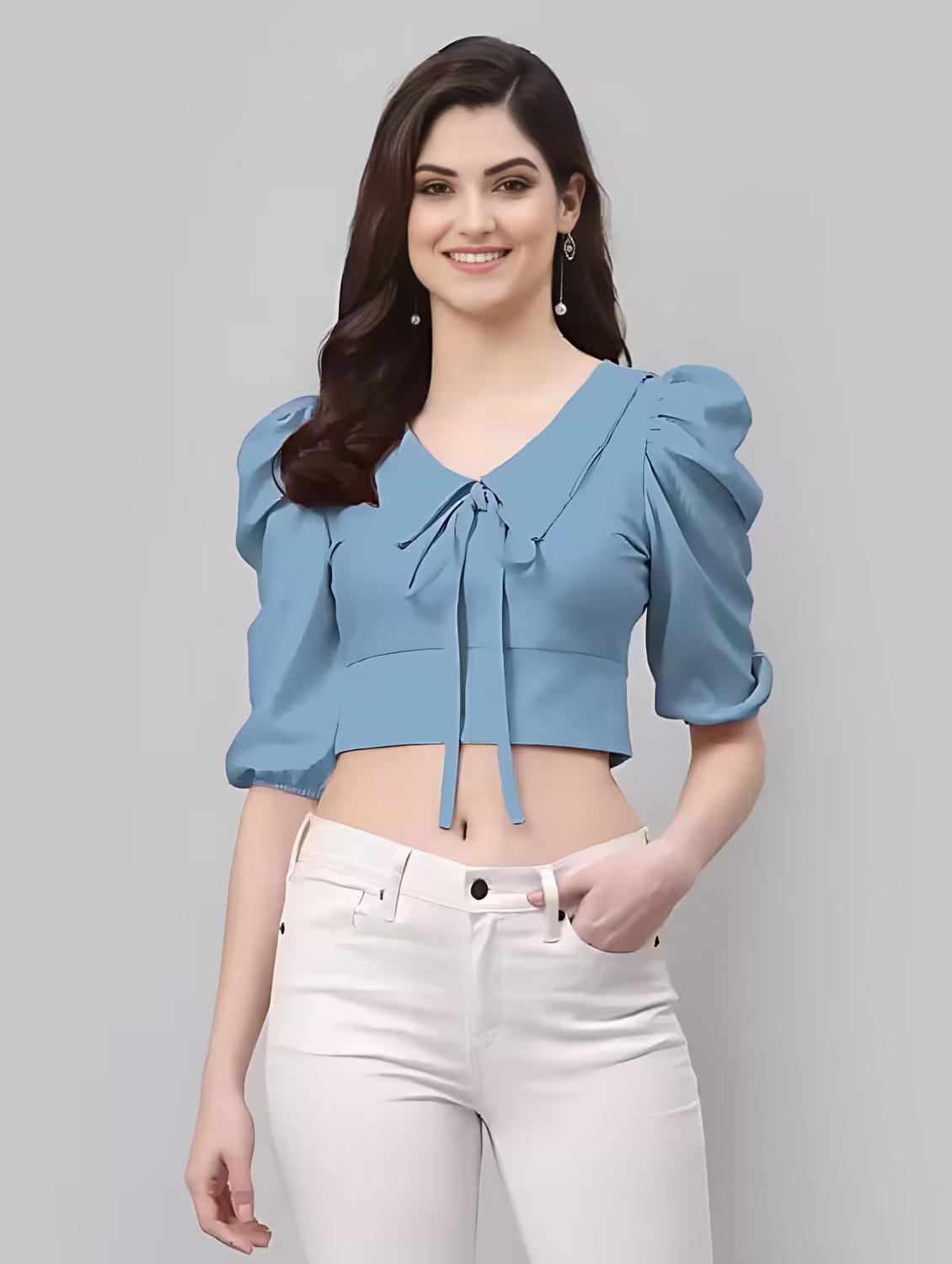 women light blue puff sleeves crop top