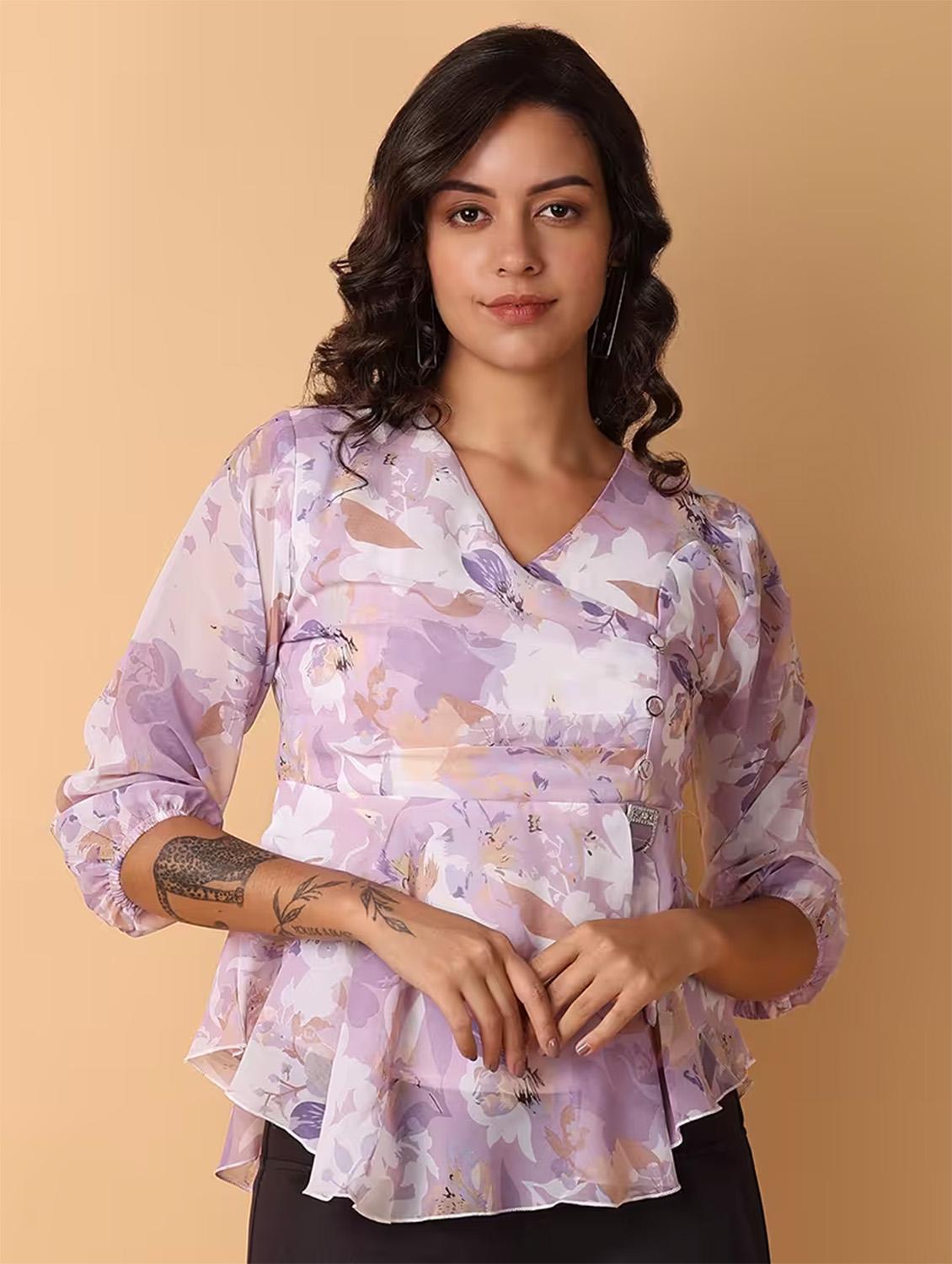 women printed overlap neck asymmetric top