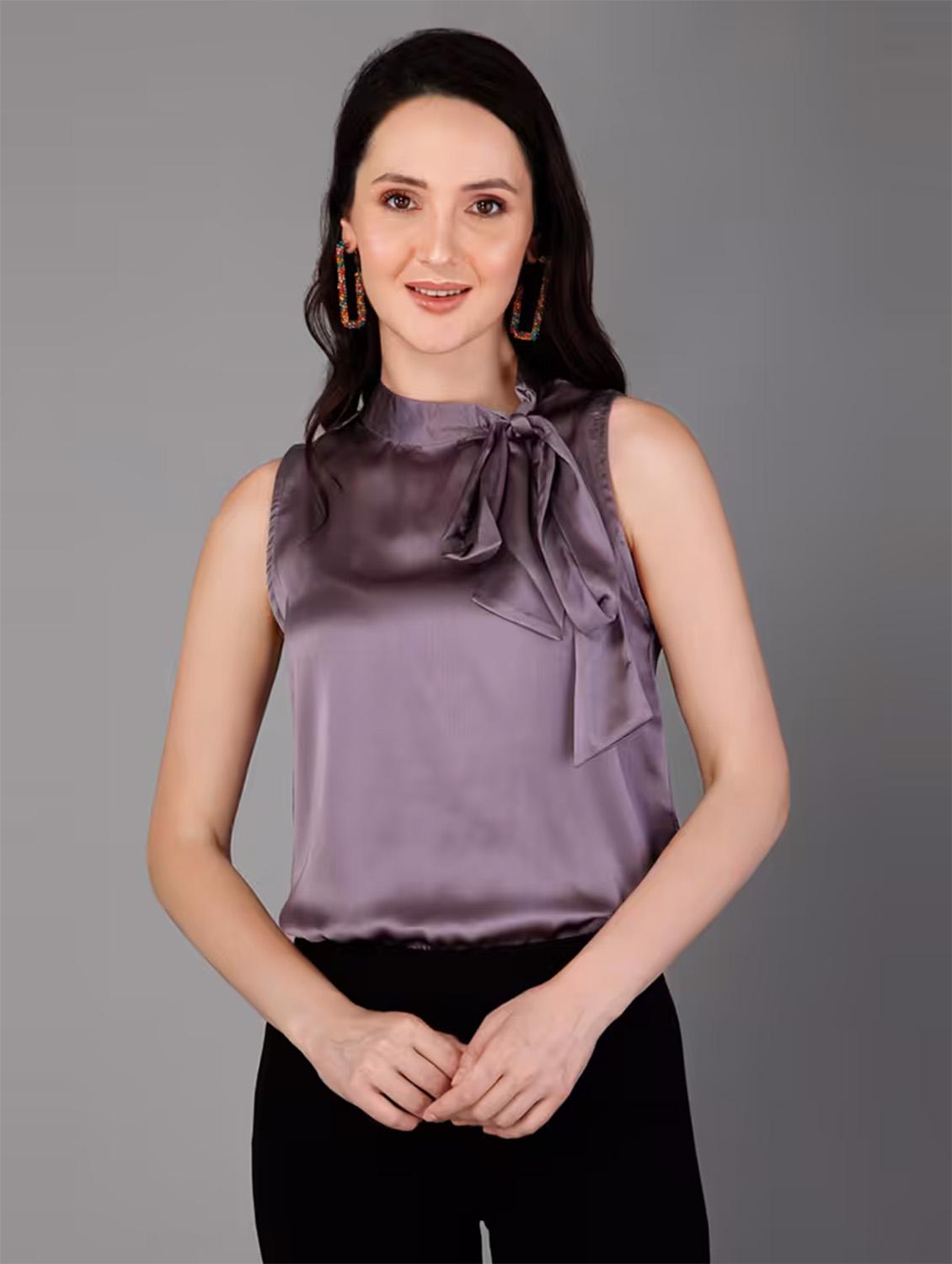 women solidtie up neck sleeves top
