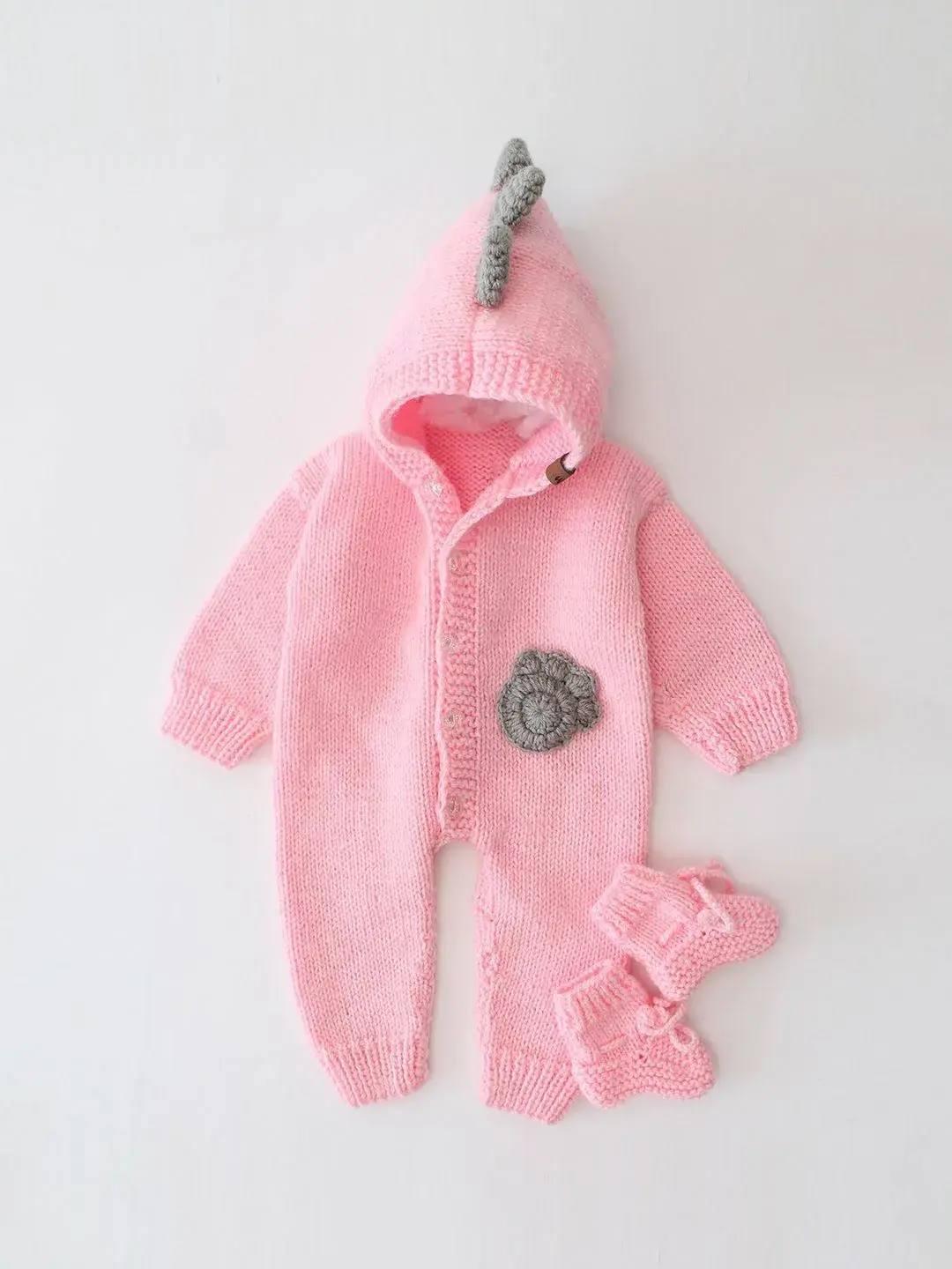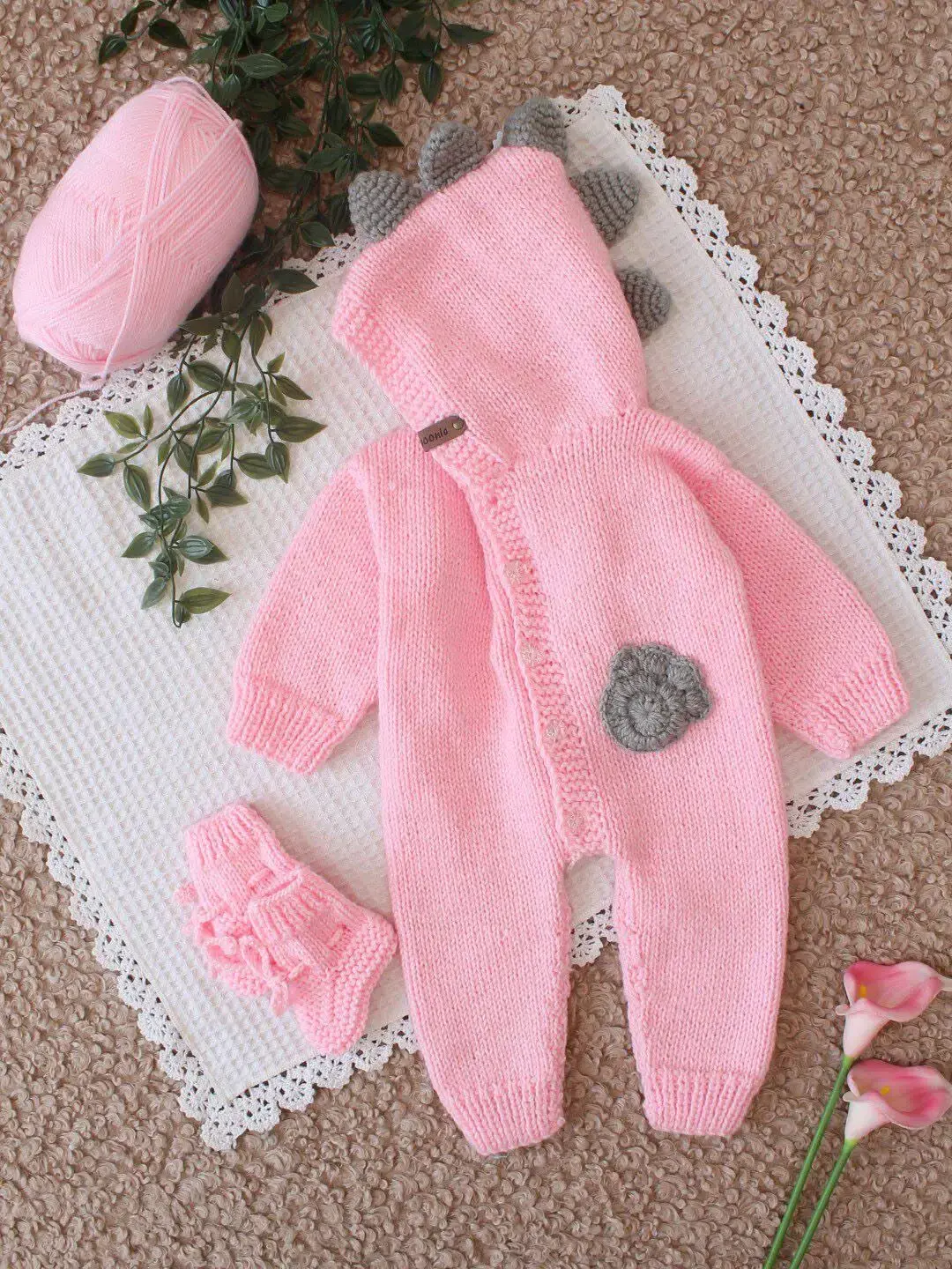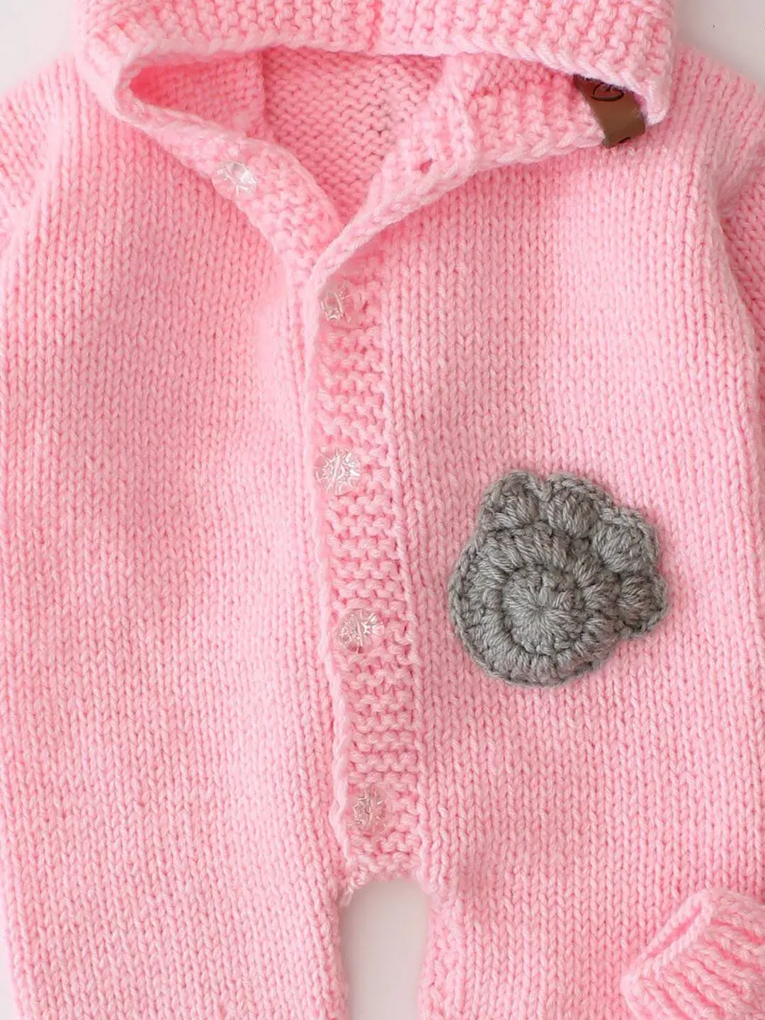 Pink self-design romper, has hooded neck, long sleeves Comes with boots